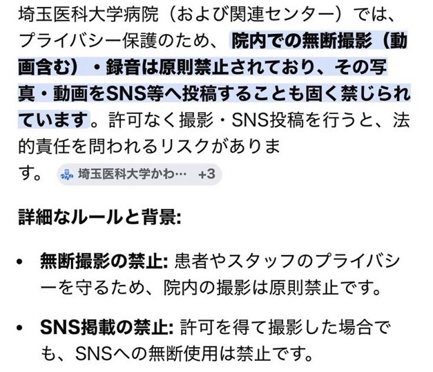 同大学の案内にもある通り、院内での無断撮影や録音、さらにSNSへの投稿は原則として禁止されている。