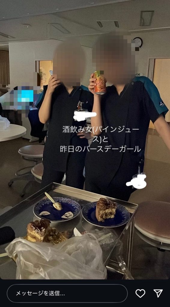 問題となっているのは、上尾中央総合病院に勤務しているとみられるスタッフによるSNS投稿だ。院内と見られる場所で、複数人が誕生日を祝う様子が写っており、ケーキや飲み物を囲む姿が確認できる。