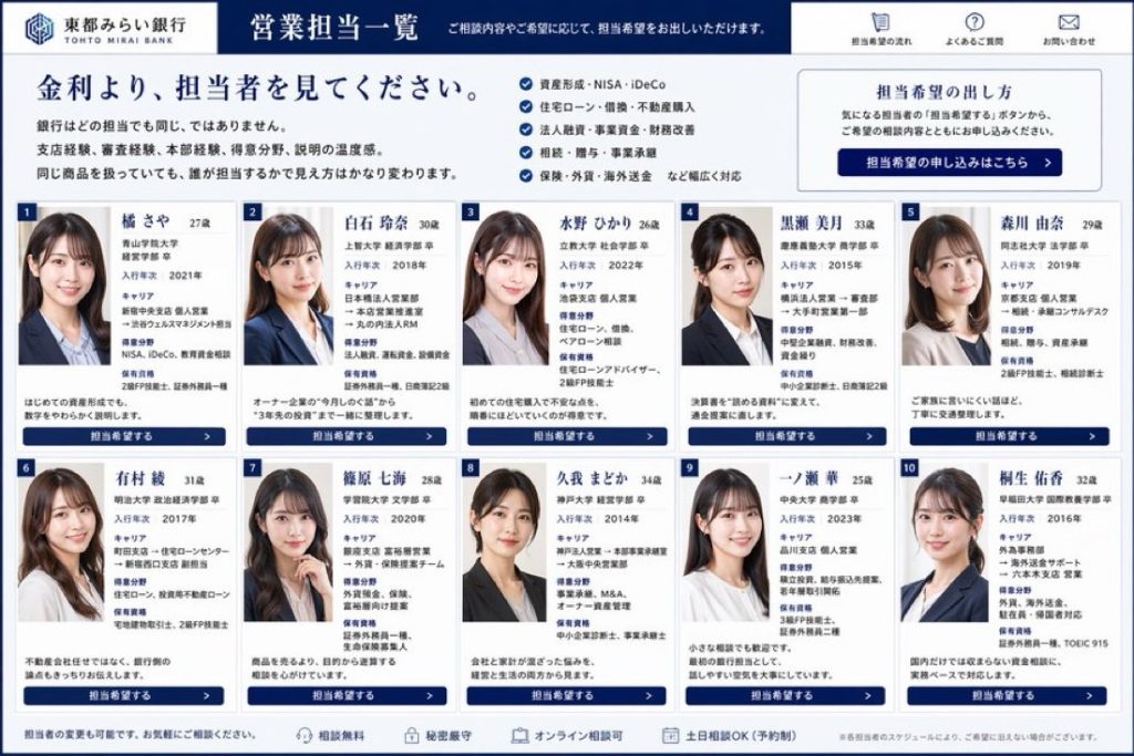 スーツ姿の女性行員が並び、それぞれにプロフィールと“担当希望”ボタンが付いた「営業担当一覧」。一見すると、金融機関というより接客業の案内ページにも見える構図だ。