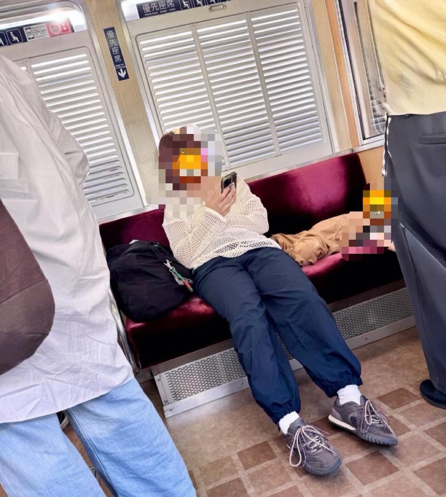 混雑する電車内で、優先席を複数占有し、さらに足を伸ばして前のスペースまで広く使う乗客の様子が撮影され、SNS上で波紋を広げている。