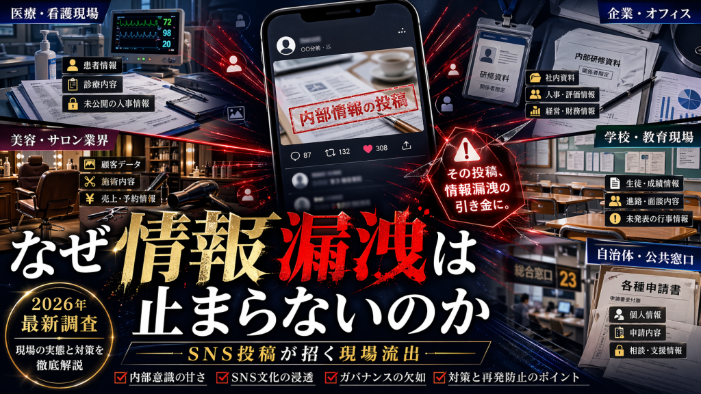 院内写真、シフト表、社内資料、窓口書類、顧客の施術中写真、制作途中の情報。こうした仕事上の情報が、いまもSNSに流れています。問題は、外部からの不正アクセスだけではありません。多くの場合、その場にいた本人がスマートフォン … 続きを読む なぜ情報漏洩は止まらないのか?看護師、美容院、大手企業、学校、市役所に共通するSNS投稿の危うさ